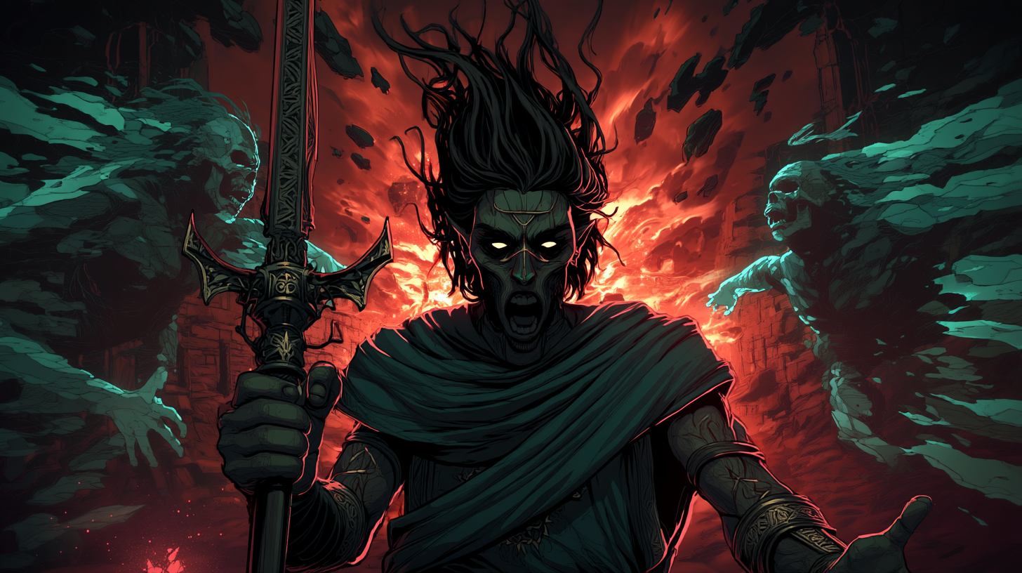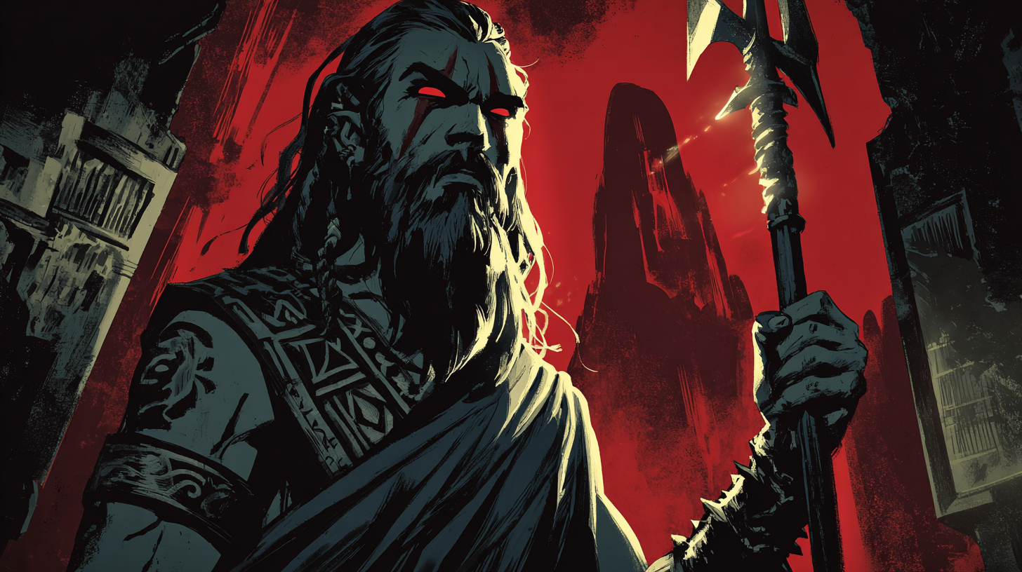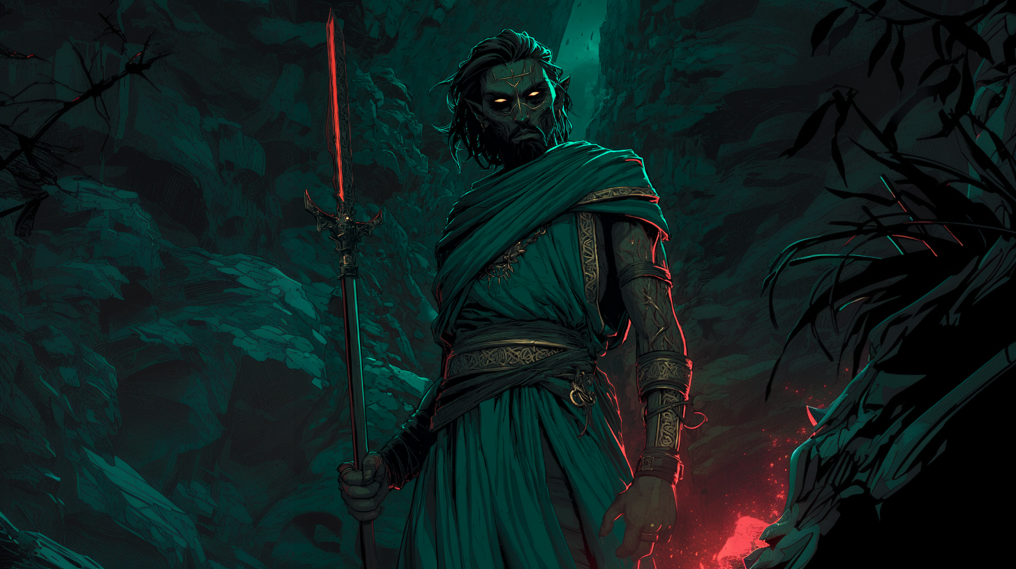 The Half-Elf Fiend Warlock embodies the intersection of mortal cunning and infernal power—sharp angular features marked by glowing amber eyes and demonic veins, wielding an obsidian spear that pulses with crimson fire. Every calculated step through the ancient tomb speaks of fiendish pacts made and prices paid.