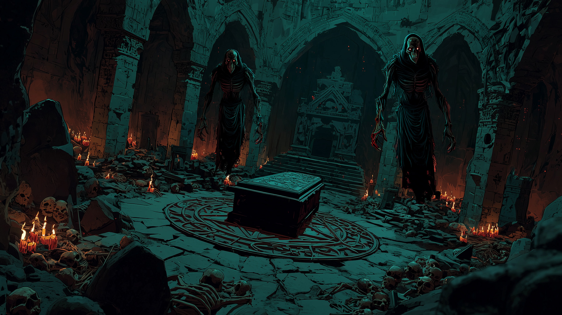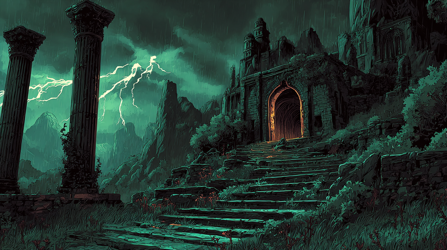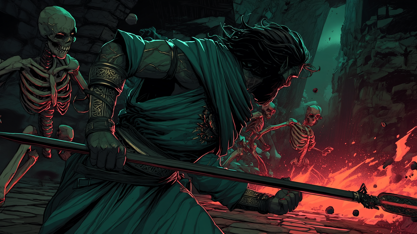 The Half-Elf Fiend Warlock embodies the intersection of mortal cunning and infernal power—sharp angular features marked by glowing amber eyes and demonic veins, wielding an obsidian spear that pulses with crimson fire. Every calculated step through the ancient tomb speaks of fiendish pacts made and prices paid.