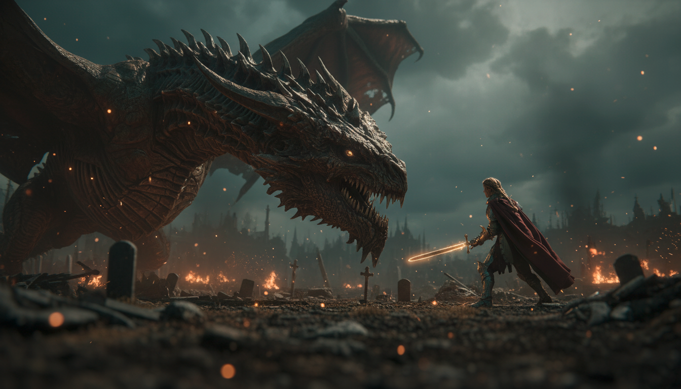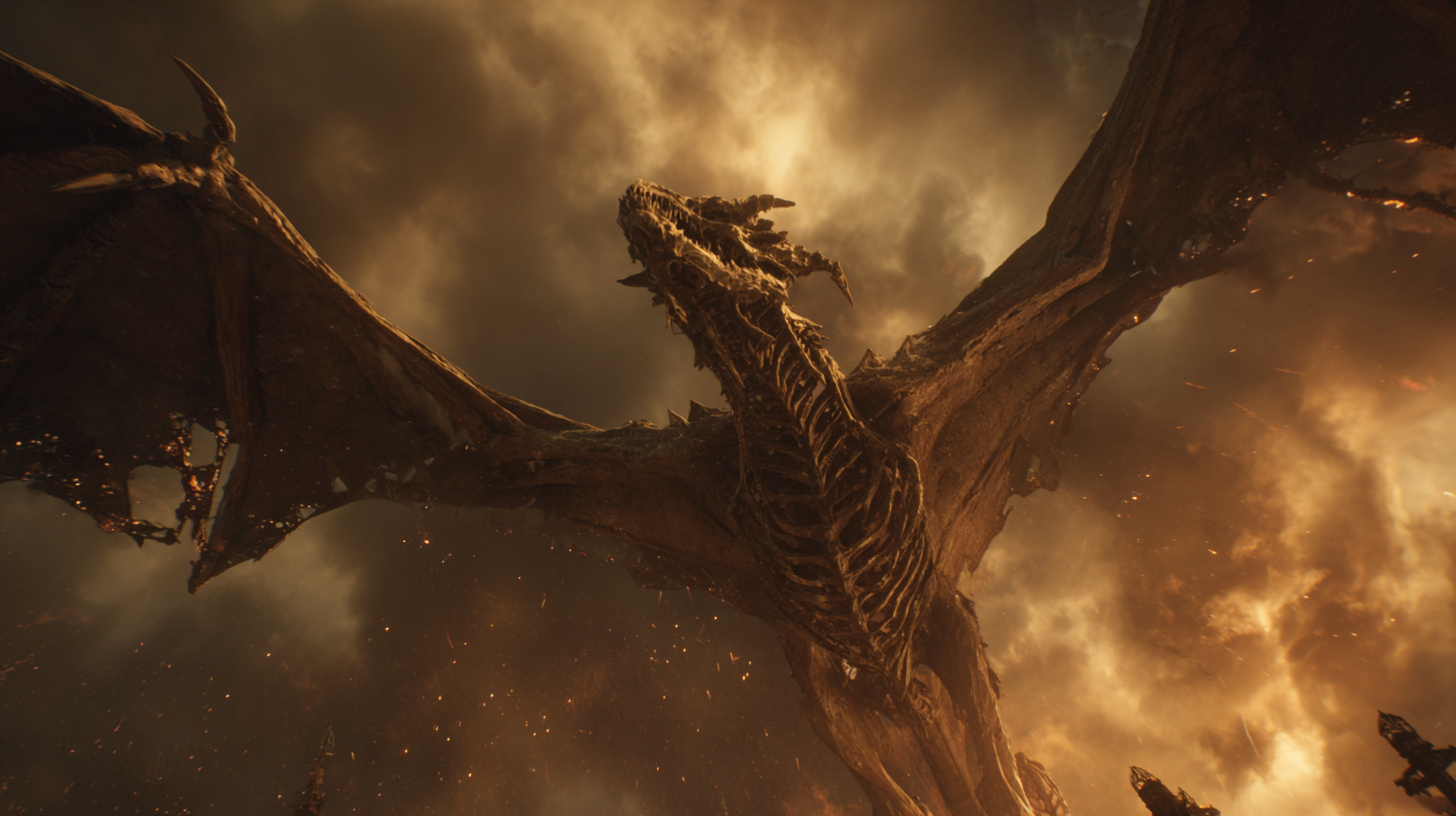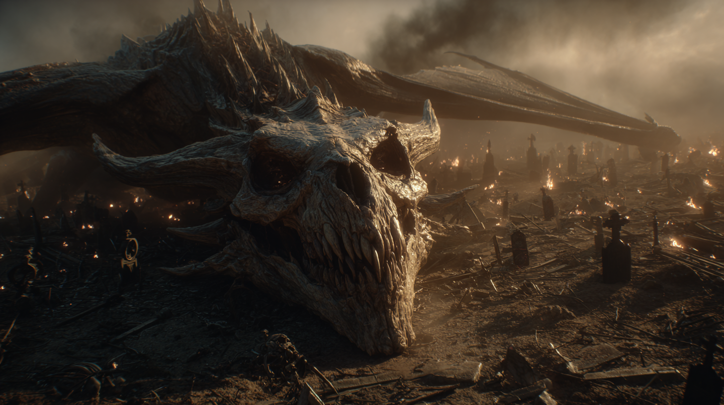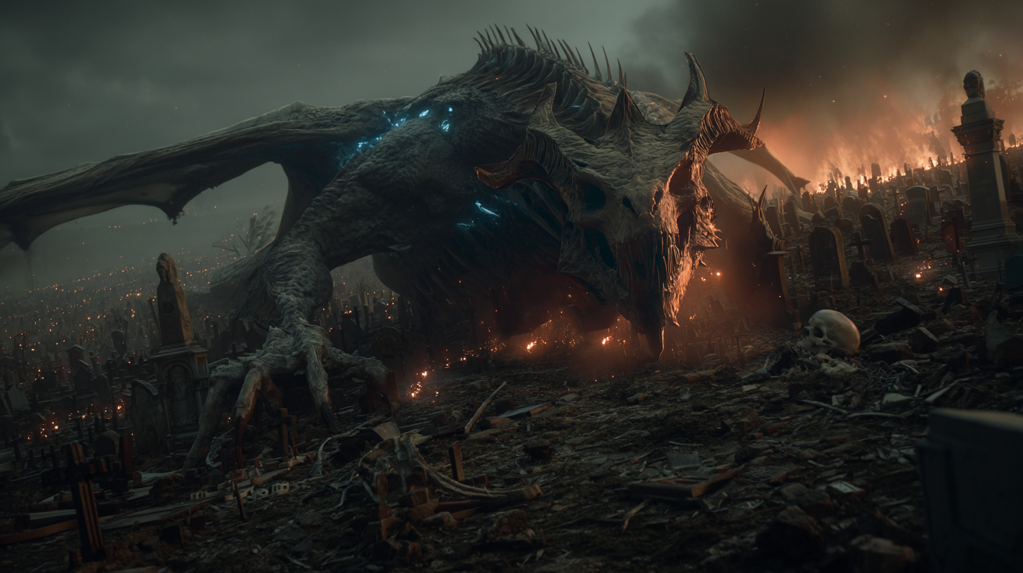 The dragon is a monument to ancient malice—bones wrapped in tattered flesh, hiding beneath stone and shadow, patient as entropy. It waits in the darkness below, a nightmare crouched between death and hunger, watching through the cracks in reality for the moment to strike.