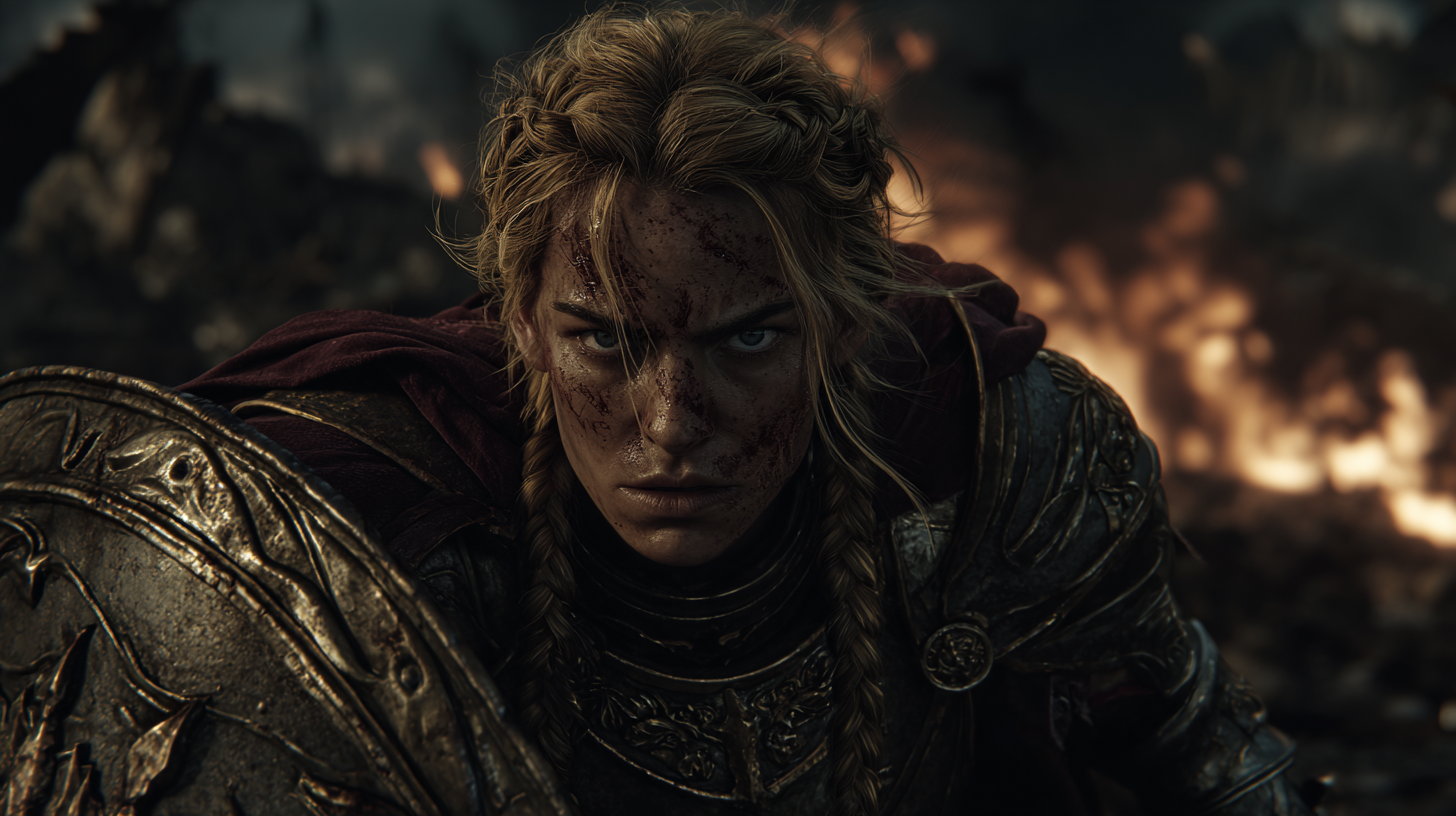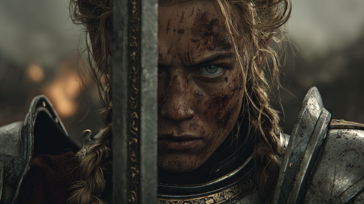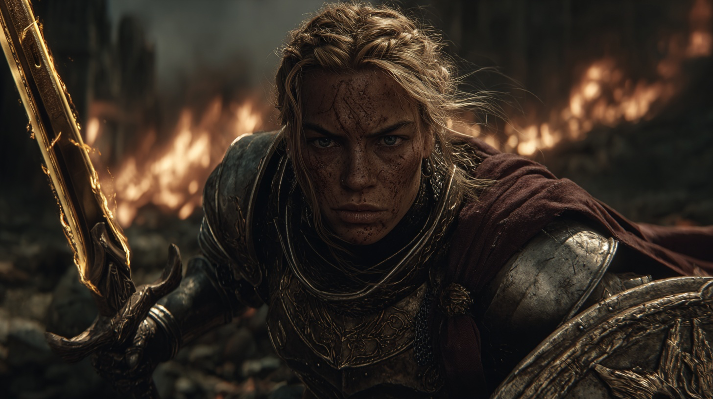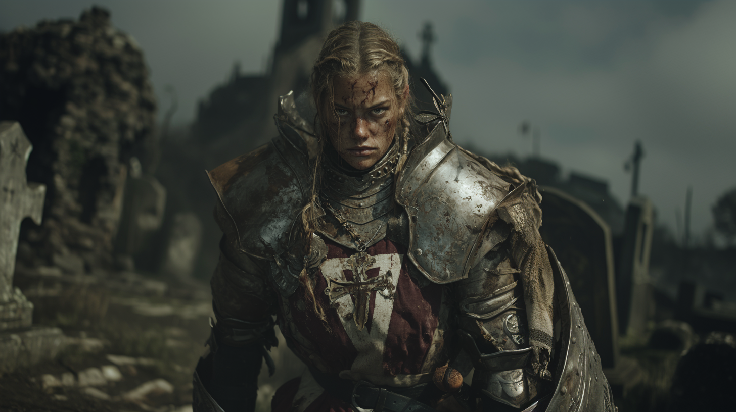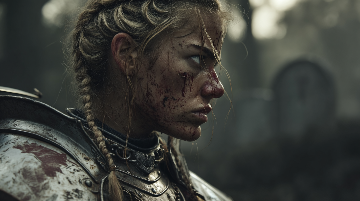 She is devotion made flesh—clad in battle-worn plate and guided by conviction that borders on obsession. Her face carries the weight of sacred oaths and sleepless nights, a warrior-saint walking alone through the valley of death, refusing to yield.