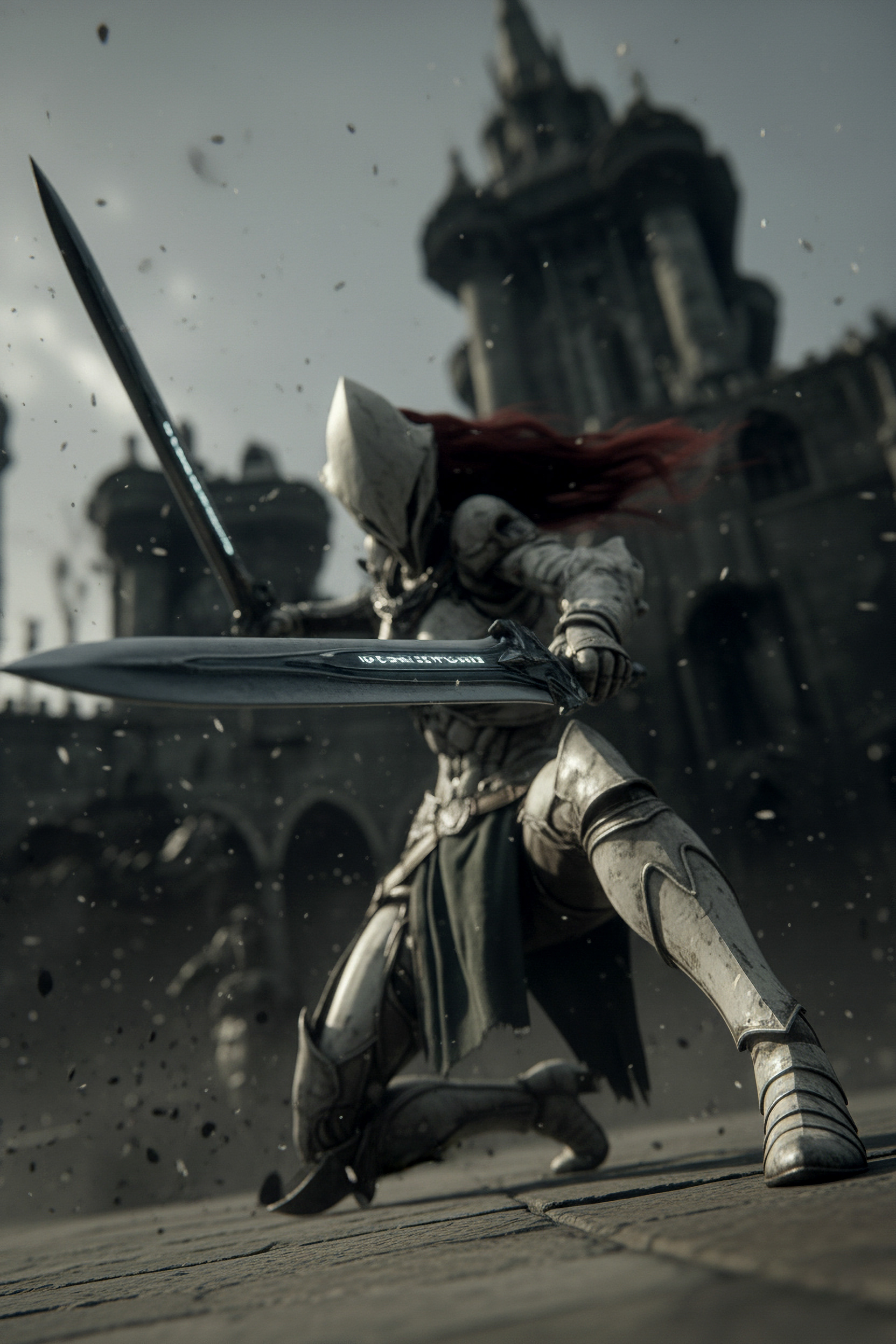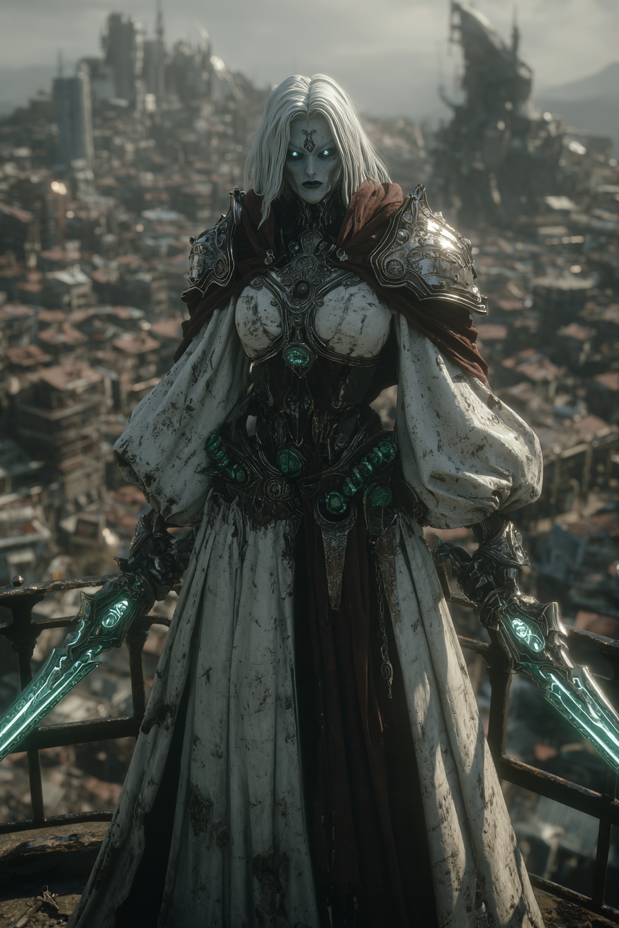 Armor like porcelain steel, fabric accents whispering in the wind, she channels a codified saberdance: reveal, pivot, feint, impact, stillness. The glow of her blades casts verdicts across weathered stone, while her gaze holds a cold, ceremonial calm. Beauty and lethality aren’t opposites here; they’re choreography.